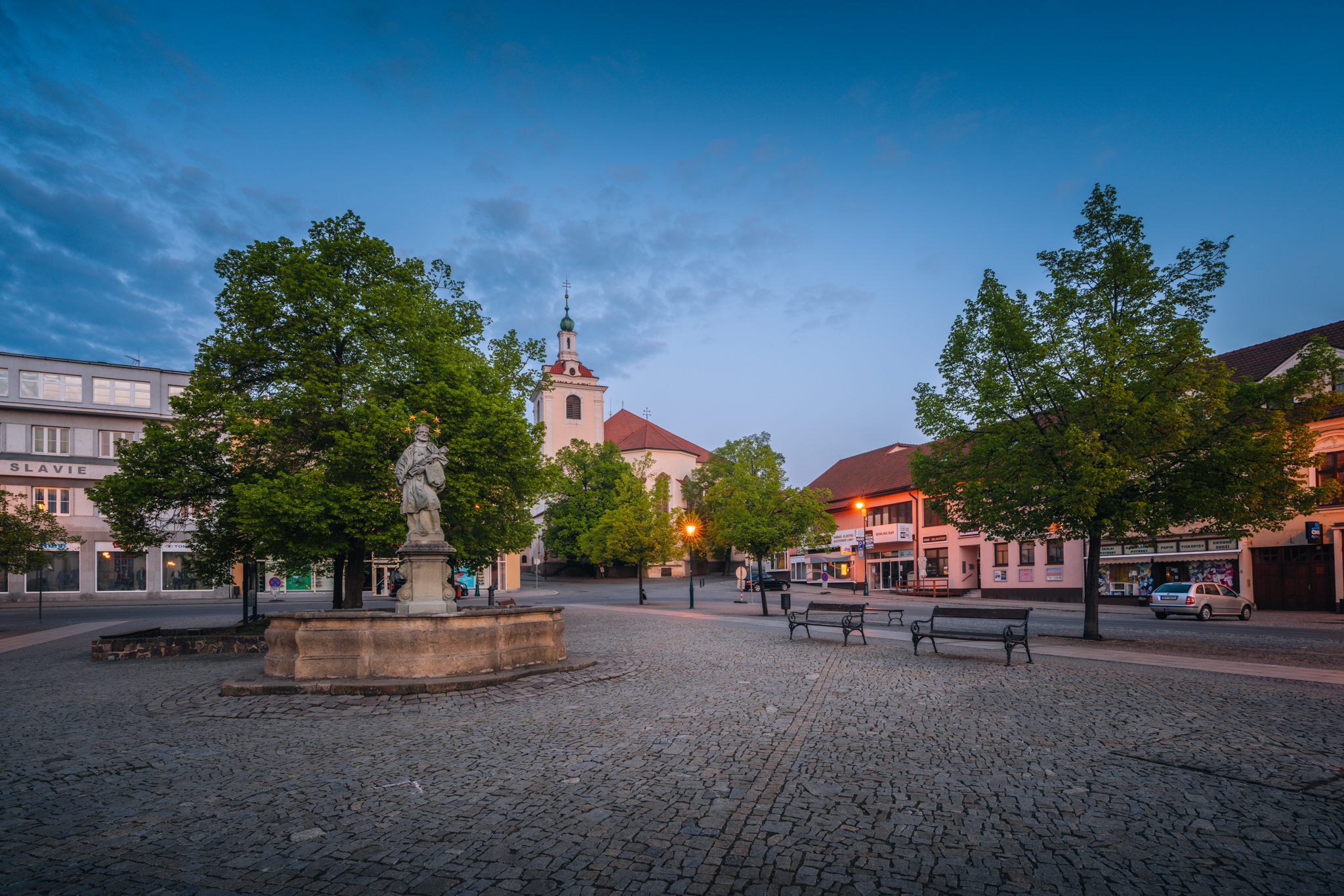 Centrum Berouna tvoří Husovo náměstí, které je městskou památkovou zónou. Dominantou náměstí je Mariánský sloup, historická budova radnice, měšťanské domy s výraznými štíty a farní kostel svatého Jakuba, původně gotická trojlodní bazilika, která byla později přestavěna v barokním slohu. Jedná se o nejvýznamnější církevní stavbu ve městě.