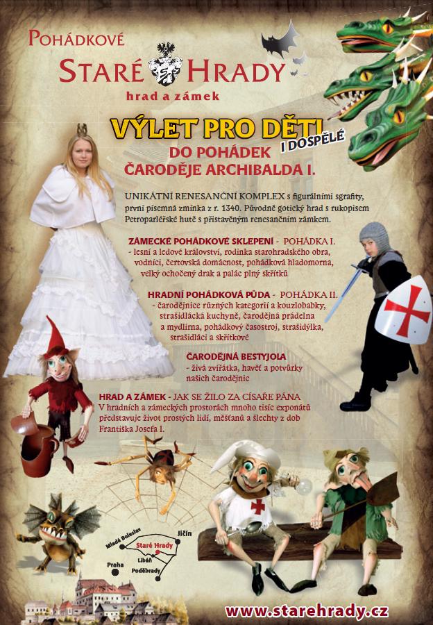 K tomu všemu Vás živé pohádkové bytosti zavedou Do pohádek čaroděje Archibalda I. Každý den po celý rok můžete v pohádkových okruzích – zámecké tajemné sklepení a – hradní pohádková půda – čarovat s našimi živými pohádkovými bytostmi – princeznami, vodnicemi, čerticemi, čaroději a čarodějnicemi a jejich sto padesáti pohádkovými kamarády ze světa pohádek.