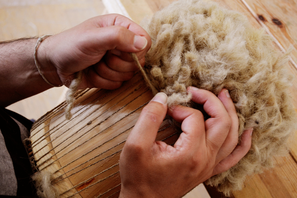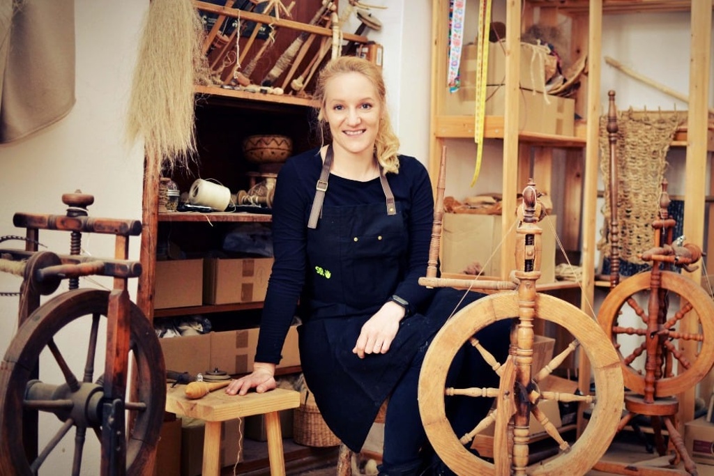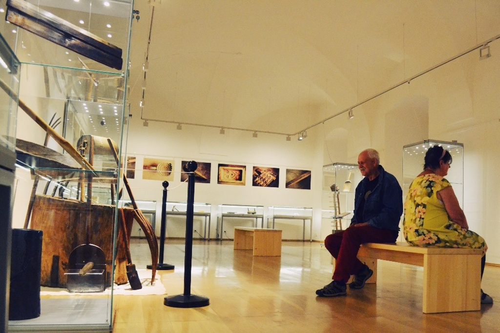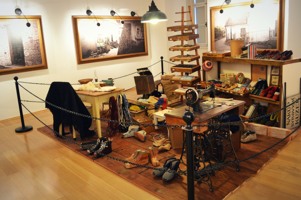V prvním sále se nachází expozice věnovaná příborským papučím zhotovovaným archaickou technikou pletení na formě.