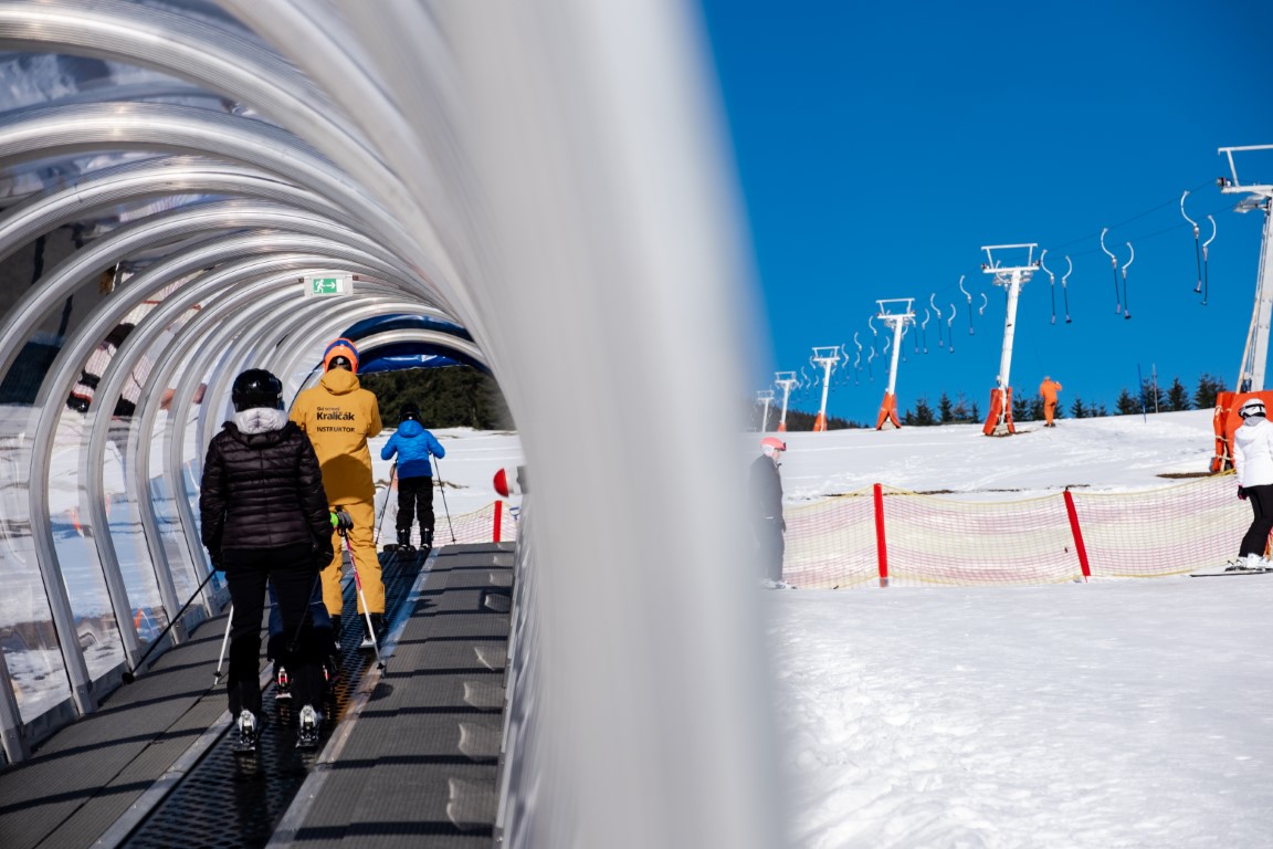 Kraličák nabízí téměř 320 metrů krytých pohyblivých pásů, které umožňují dětem bezpečné učení lyžování i za šera díky osvětlení. Tento prvek, běžný ve špičkových zahraničních střediscích, je v České republice výjimečný.