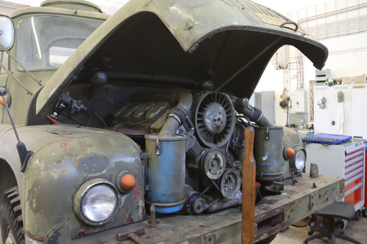 Pohled na motor nákladního vozu TATRA 138 v dílnách VTM Lešany. FOTO Jiří Reichl, VHÚ Praha