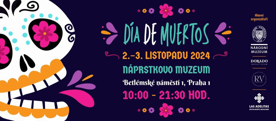 Zažijte Halloween jinak: nejživější festival roku se opět vrací do Náprstkova muzea v samotném srdci Prahy! 2.-3. listopadu na vás čeká mnoho zábavy. Připravte se na dny plné hudby, folklórního tance, kultury, umění a zábavy, který vás naprosto pohltí. Tato pestrobarevná akce, která oslavuje život, je organizována mexickou komunitou v Praze ve spolupráci s Národním muzeem a Městskou částí Praha 1. Přijďte a staňte se součástí tohoto úžasného festivalu, jehož vrcholem bude tradiční průvod směřující na Staroměstské náměstí a nezapomenutelná závěrečná party!
