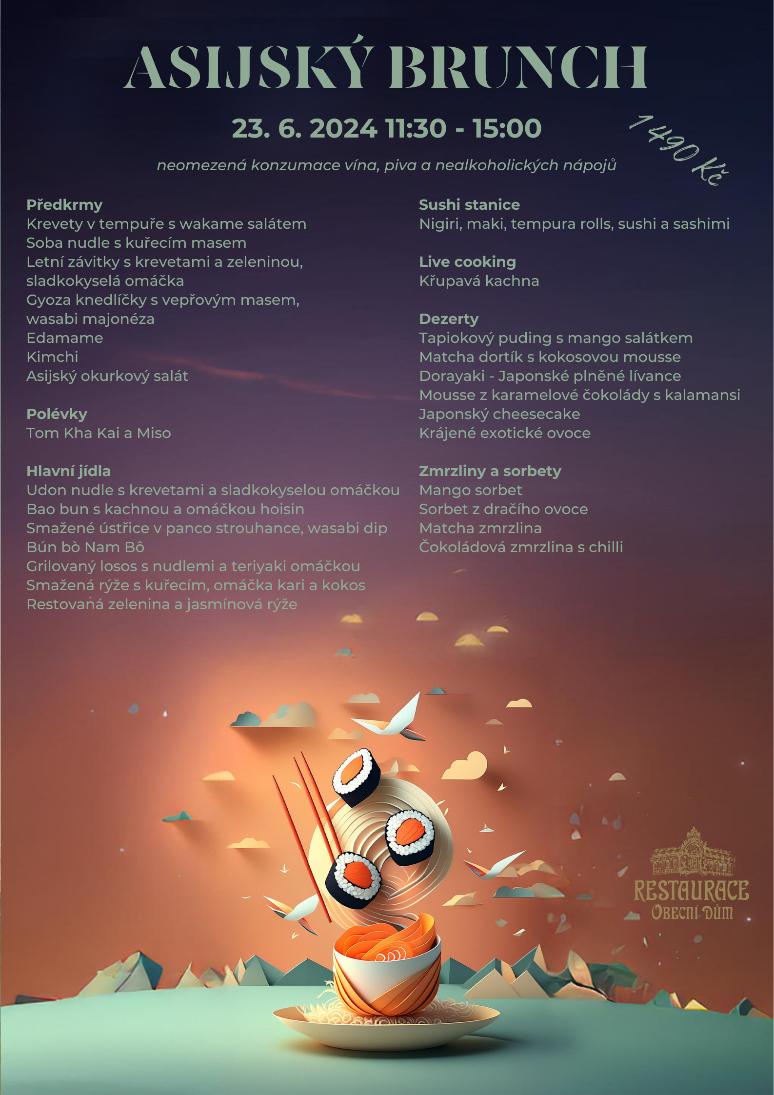 Připravte se na nezapomenutelný kulinářský zážitek! Restaurace Obecní dům Vás srdečně zve na Asijský Brunch, který se uskuteční 23. června 2024. Přijďte si vychutnat rozmanité a lahodné pokrmy inspirované asijskou kuchyní, které potěší nejen Vaše chuťové buňky, ale také oko.
