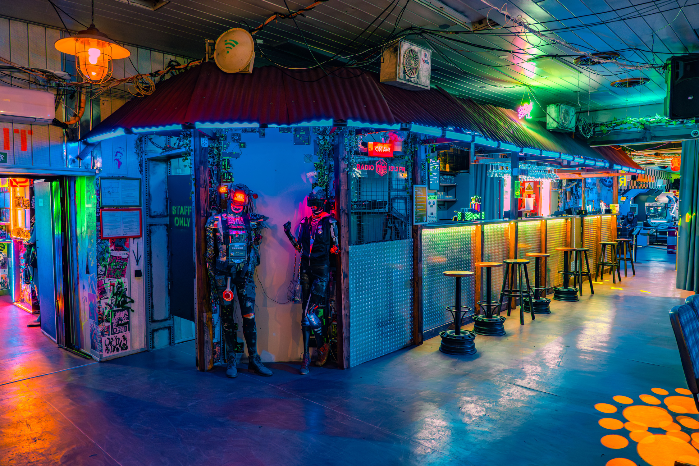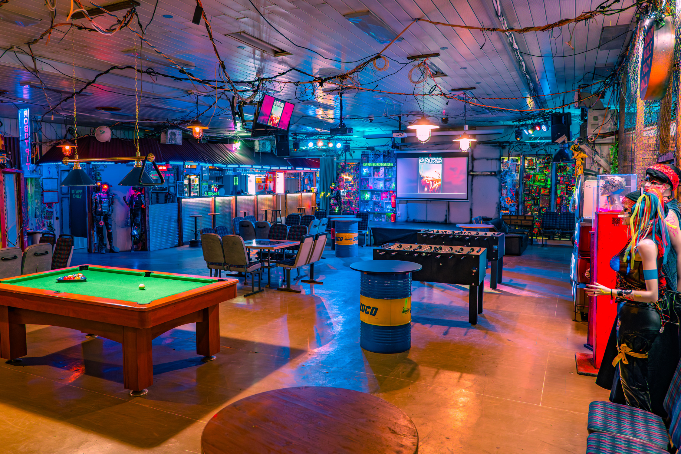 Celý prostor nese výrazný cyberpunkový charakter a působí velmi atraktivně pro firemní i volnočasové skupiny.