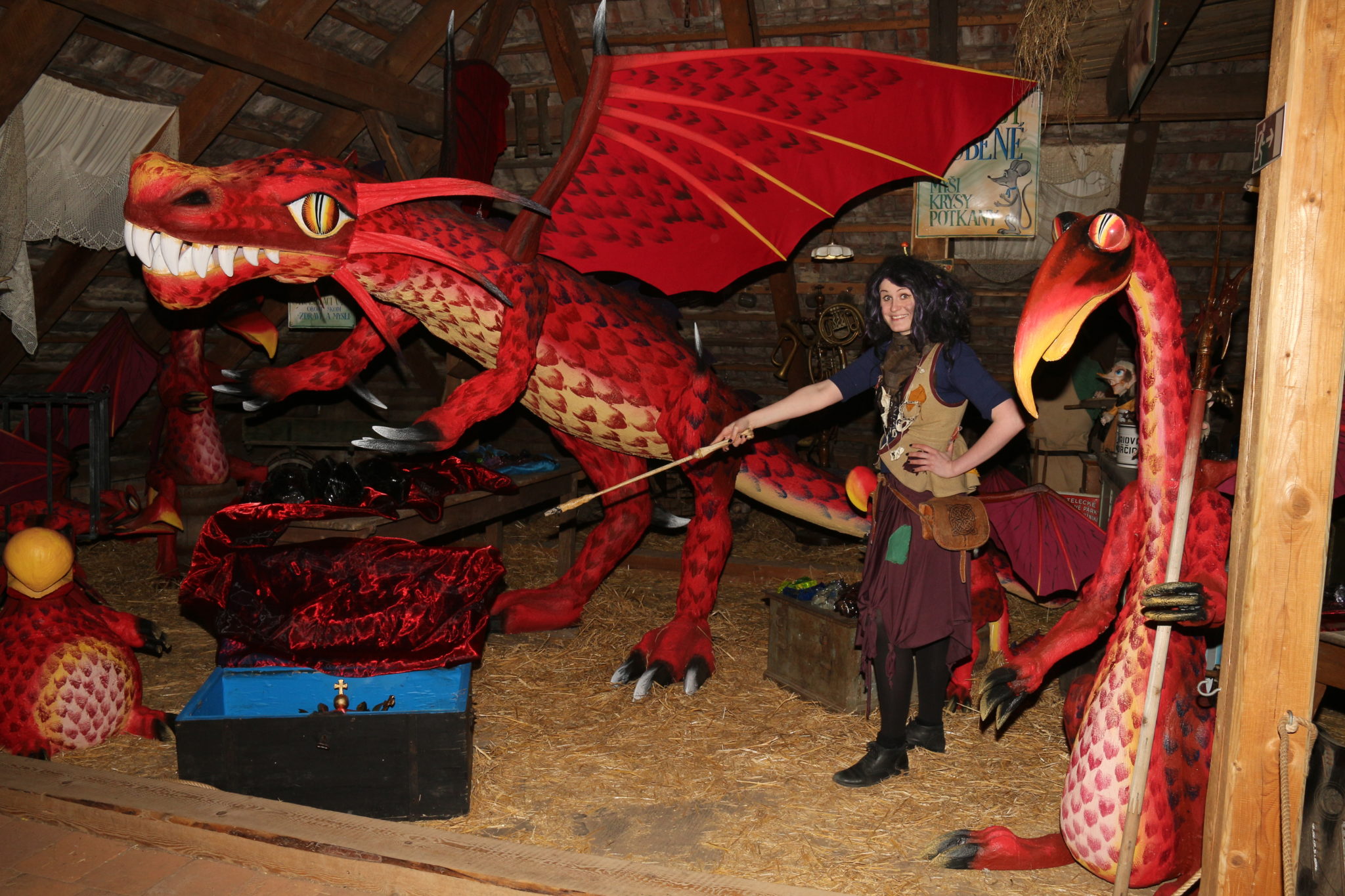 Na HRADNÍ POHÁDKOVÉ PŮDĚ vás čeká lekce čarodějného létání na koštěti, a kromě čarodějnic a skřítků, i strážci velkého dračího pokladu – Obří rubínoví draci.