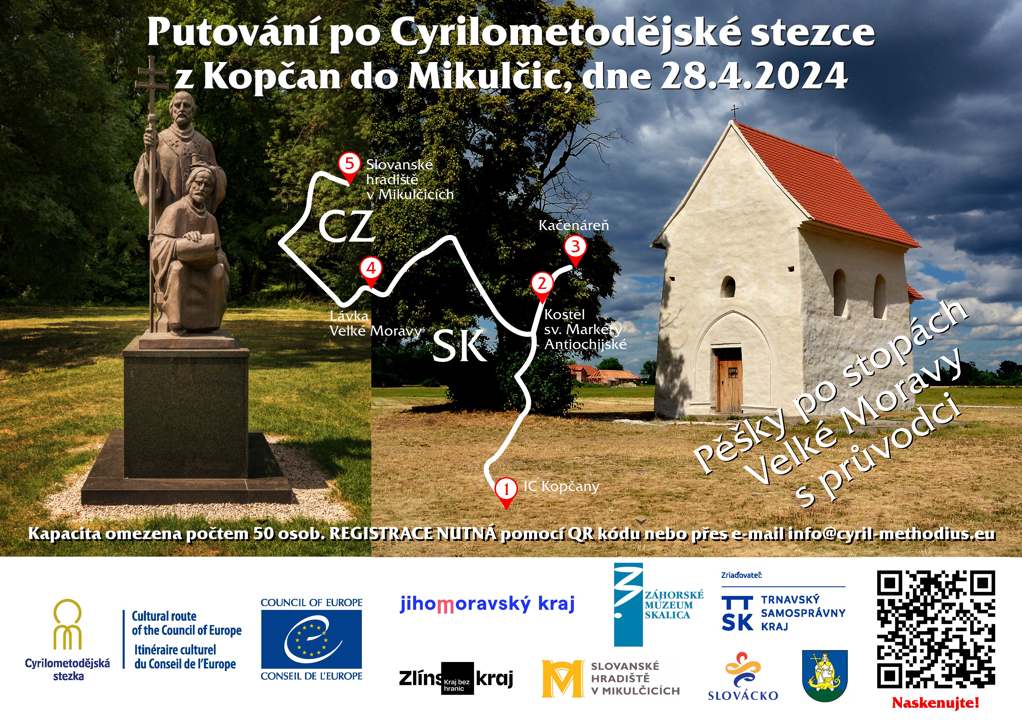 Sdružení Evropská kulturní stezka sv. Cyrila a Metoděje zve příznivce turistiky a kulturního dědictví na jednodenní putování po Cyrilometodějské stezce z Kopčan do Mikulčic po stopách Velké Moravy s průvodci. Akce se uskuteční v neděli 28. 4. 2024 od 10 hodin.