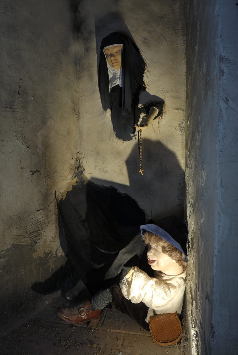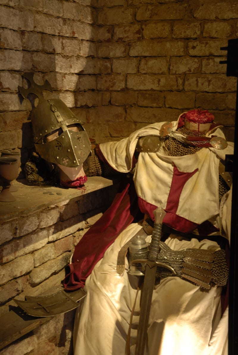 Ve sklepních prostorách, jejichž součástí je i sklep ze 12. století, je vybudována ulička s několika zákoutími, která evokují atmosféru půlnoční Prahy před mnoha staletími. V této uličce se pak setkáte s 25 nejznámějšími pražskými strašidly. Některá uvidíte přímo, ale mnoho jich je poschovávaných všude okolo Vás. Vykukují z oken, jsou za pootevřenými dveřmi, vrhají stín na stěnu, anebo létají kdesi u stropu.