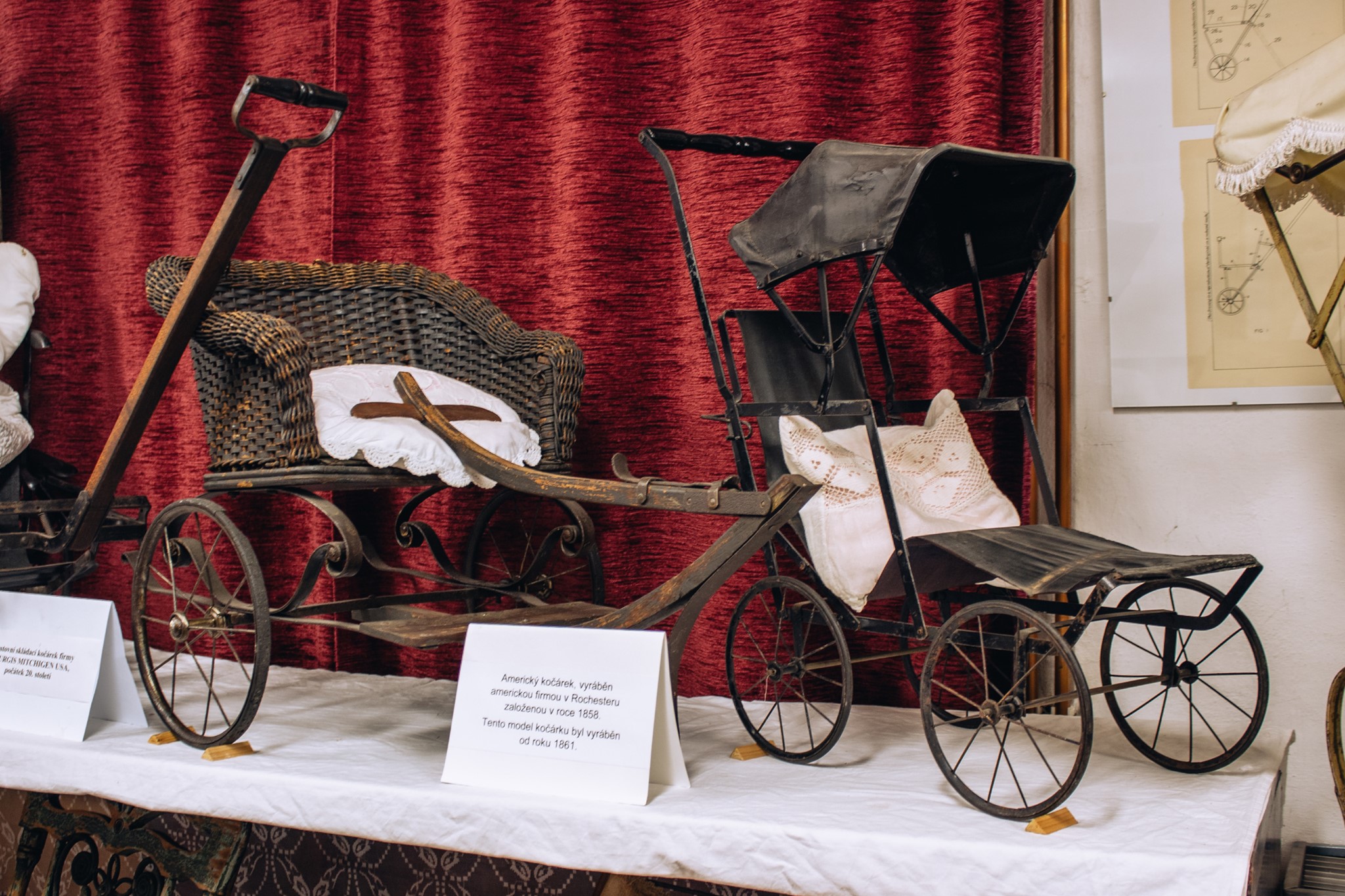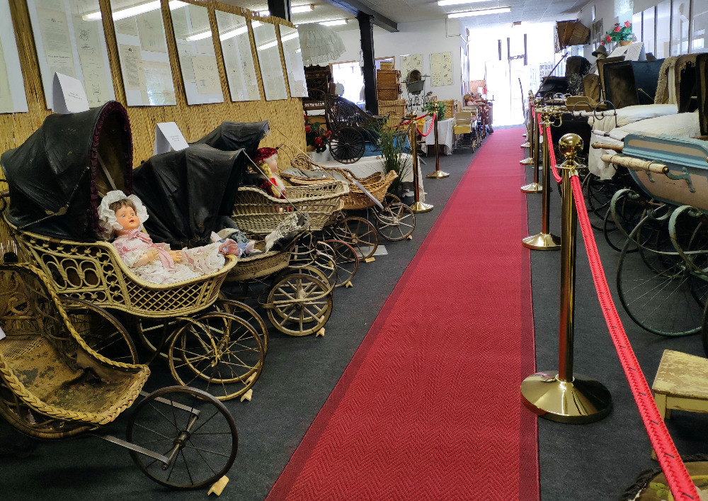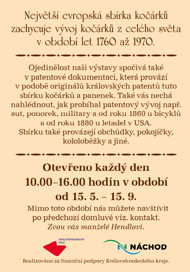 Každý z nás se v minulosti s dětským kočárkem důvěrně setkal… Dnes si můžete své vzpomínky osvěžit a potěšit se nádherou těchto starožitných kočárků. V našem muzeu můžete obdivovat vývojovou řadu dětských kočárků, vyrobených v období let cca 1760 až 1970. Je jich již dvě stovky a přibývají další. Výstava kočárků je doplněna v druhém podlaží také houpacími koni, koloběžkami, kolíbkami či sáňkami apod. Expozici doprovázejí i dobové dekorace jako jsou panenky, hračky, pokojíčky nebo různé technickými zajímavosti – především v podobě originálních výrobních patentů.