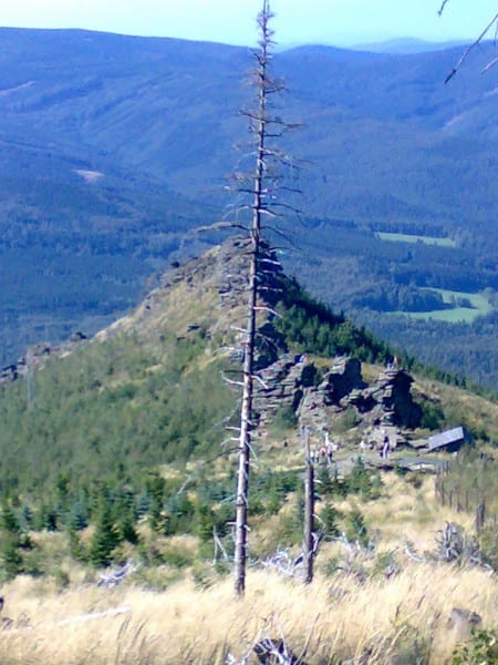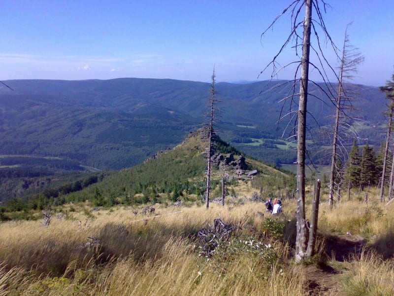 Od chaty Jiřího po zelené a žluté turistické značce pasekou kolem borůvčí a potom docela prudký sešup lesem s kamenitou cestičkou, průvodci říkají o náročnosti stupně č.2-3, nesmí se zde na horském kole. Nesmí se šlapat jinam než je vyznačeno, ale borůvkáři a houbaři se to jen v lese hemžilo. Nádherný výhled a dobrý vzduch zaručuje skvělé podmínky pro výlet. Pod Obřími kameny je dole vpravo odpočívadlo se stříškou. Je tam potom také rozcestí a můžete se vydat i jinam než my k Vražednému potoku. Prý je to i ráj pro horolezce,my tam zrovna žádné neviděli.