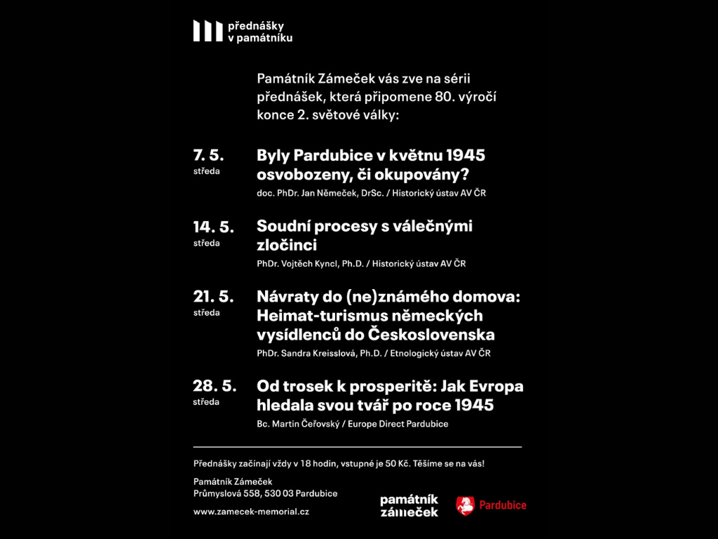 Každou květnovou středu se od 18 hodin zaměříme na téma spojené s koncem války a poválečným vývojem v Evropě. Jako první památník navštíví Jan Němeček, který 7. května promluví o osvobozování (nebo snad okupaci?) Pardubic sovětskou armádou. Následující týden Vojtěch Kyncl přiblíží poválečné soudní procesy včetně toho s K. H. Frankem. Třetí květnová středa, tedy 21. května, bude patřit Sandře Kreisslové a tématu turismu odsunutých Němců do Československa. Cyklus přednášek zakončí Martin Čeřovský s tématem formování evropského povědomí po 2. světové válce.