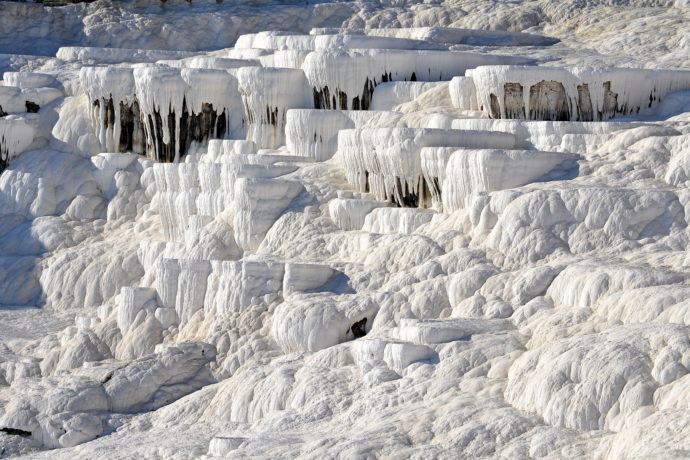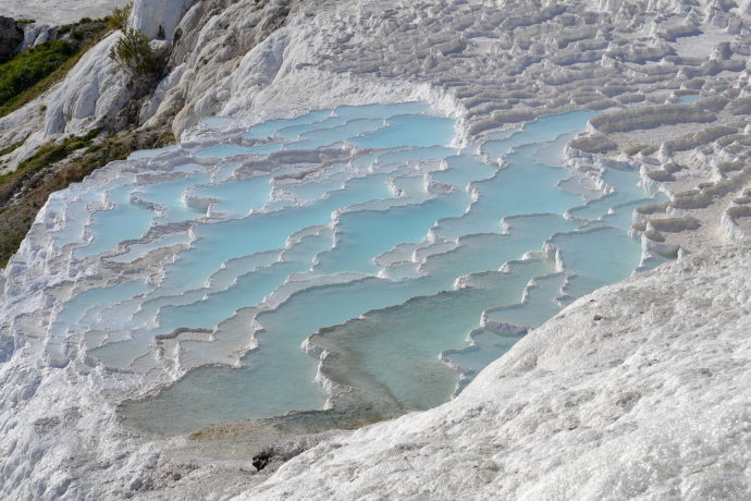 Na jihozápadě Turecka se nachází vápencové terasy, které jsou známé pod názvem Pamukkale neboli Bavlněný hrad. Terasovitá jezírka si zamiluje každý, kdo do této části země zavítá. Vyvěrají zde minerální prameny bohaté na vápník. Už více jak 14 tisíc let se vápník usazuje v podobě kaskád a vytváří kontrast v podobě zářivě bílých teras a průzračně modrých jezírek.