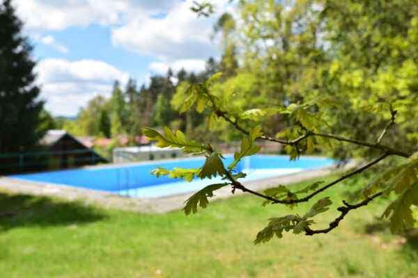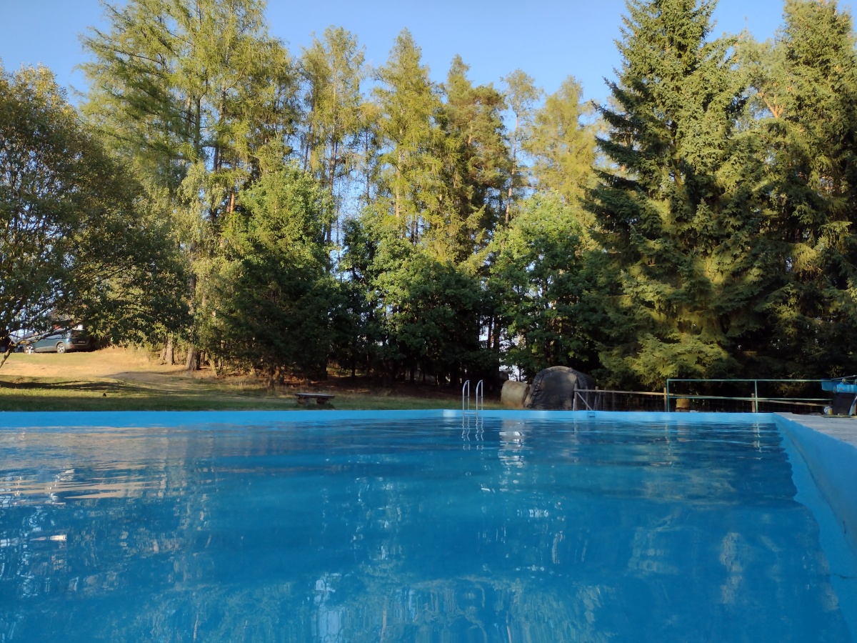 Pro hosty je k dispozici opravdu velkorysý venkovní bazén — požární nádrž o rozměru 20×10 metrů s hloubkou od 60 do 120 cm. Hloubka se svažuje po kratší straně, takže na hlubší straně můžete pohodlně plavat po celé délce a nebudou vás rušit děti, které se cachtají na mělčině. Bazén je skutečně ideální i pro malé děti, protože má bezpečnou hloubku. V areálu je k dispozici krásná finská sudová sauna s teráskou a ochlazovací kádí. Sauna je vytápěná kamny na dřevo. Sauna má vnitřní i venkovní osvětlení a k dispozici je i venkovní ohniště, takže když napadne sníh, je saunování opravdu parádní zážitek.
