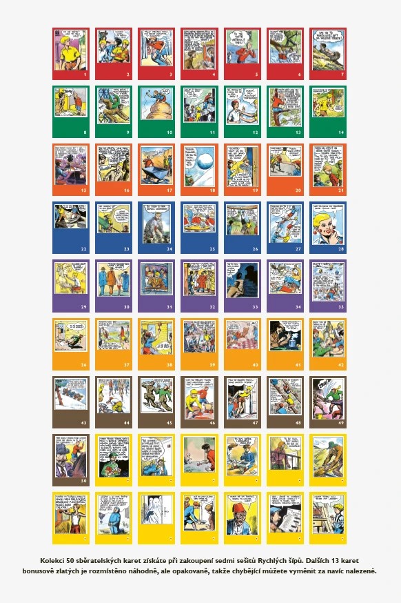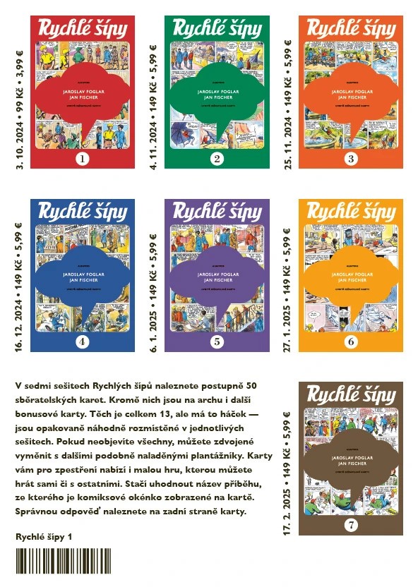 Každý sešit navíc obsahuje sběratelské karty, které jistě podpoří zájem o pětici kluků, jejichž přátelství, odvaha i smysl pro humor jsou dnes tolik potřeba. Rychlé šípy jsou nejen součástí naší kulturní historie, ale i inspirací pro mladé čtenáře. „Jsme nadšeni, že můžeme tuto klasiku znovu po 57 letech přivést k životu v původním provedení s rekonstruovanými malbami Jana Fišera a následně Marko Čermáka tak, jak vycházelo v sešitové podobě od prosince 1967,“ dodává Müller.