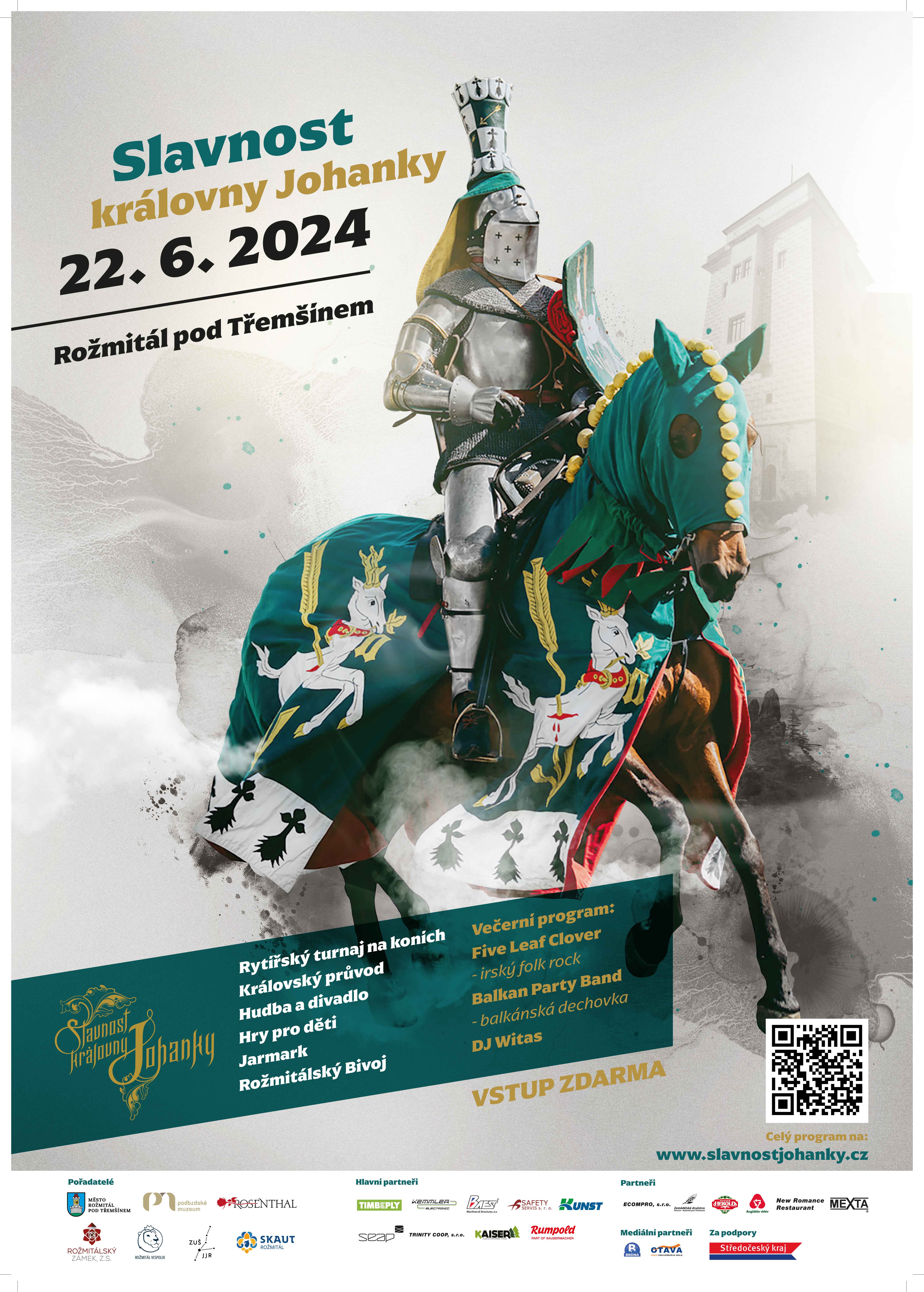 „Vrcholem letošní Slavnosti královny Johanky bude opravdu velkolepý turnaj na koních v zámecké zahradě po 14. hodině, v podání rytířů z Agentúry Hector. Zavítali k nám už před šesti lety a jejich vystoupení bylo nezapomenutelné,“ přibližuje hlavní lákadlo Slavnosti Pavla Váňová Černochová, vedoucí Podbrdského muzea. „Turnaj dal letos obrysy celému pestrému programu slavnosti, dorazí hned několik rytířských skupin. Nabídnou pohled do středověkého vojenského ležení i historickou hudbu, děti mohou projít „verbováním“ v rámci interaktivního představení na zámeckém nádvoří nebo se zapojit do výtvarné přehlídky a opravdoví siláci změří své síly v soutěži Rožmitálský Bivoj,“ dodává.