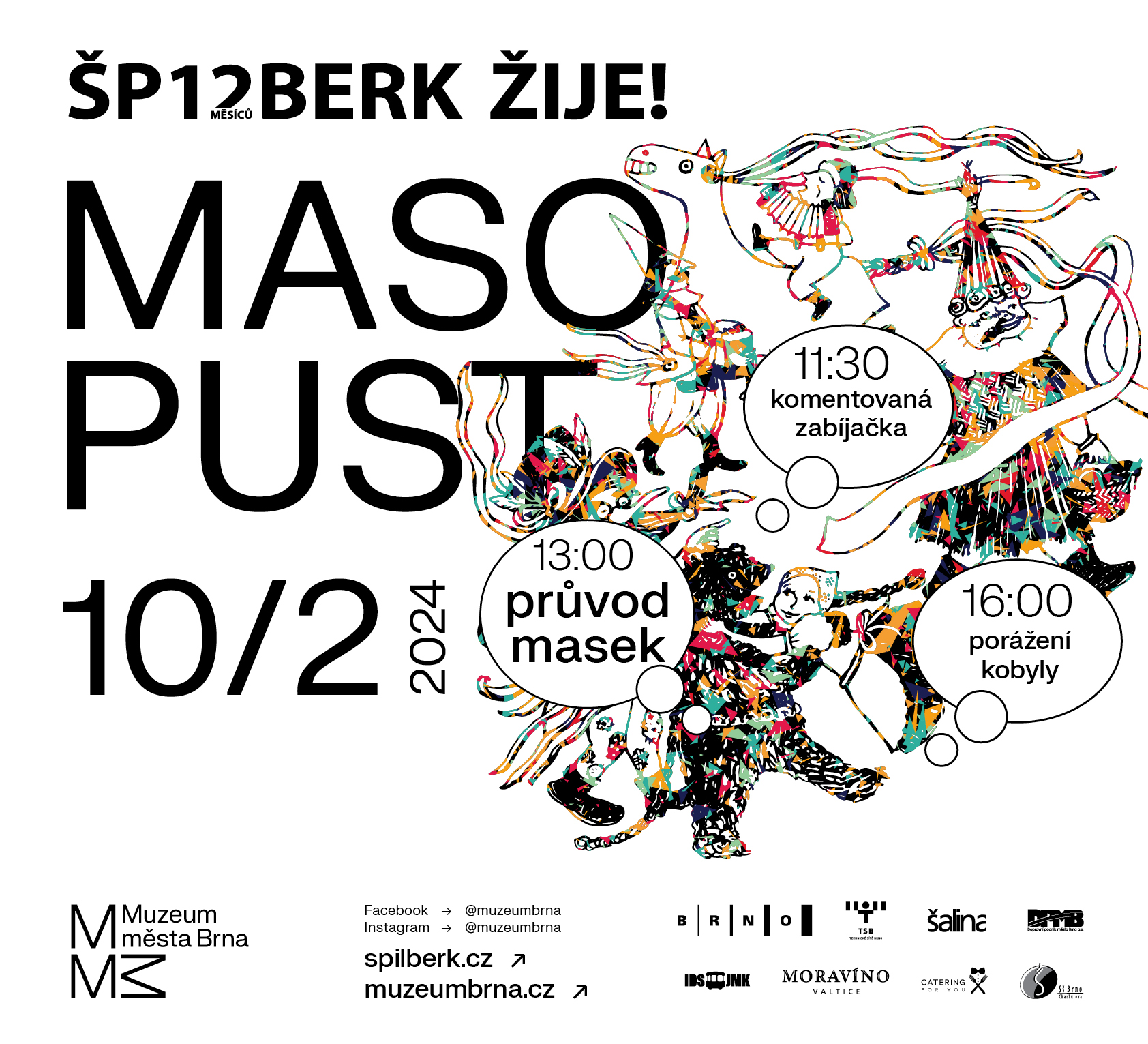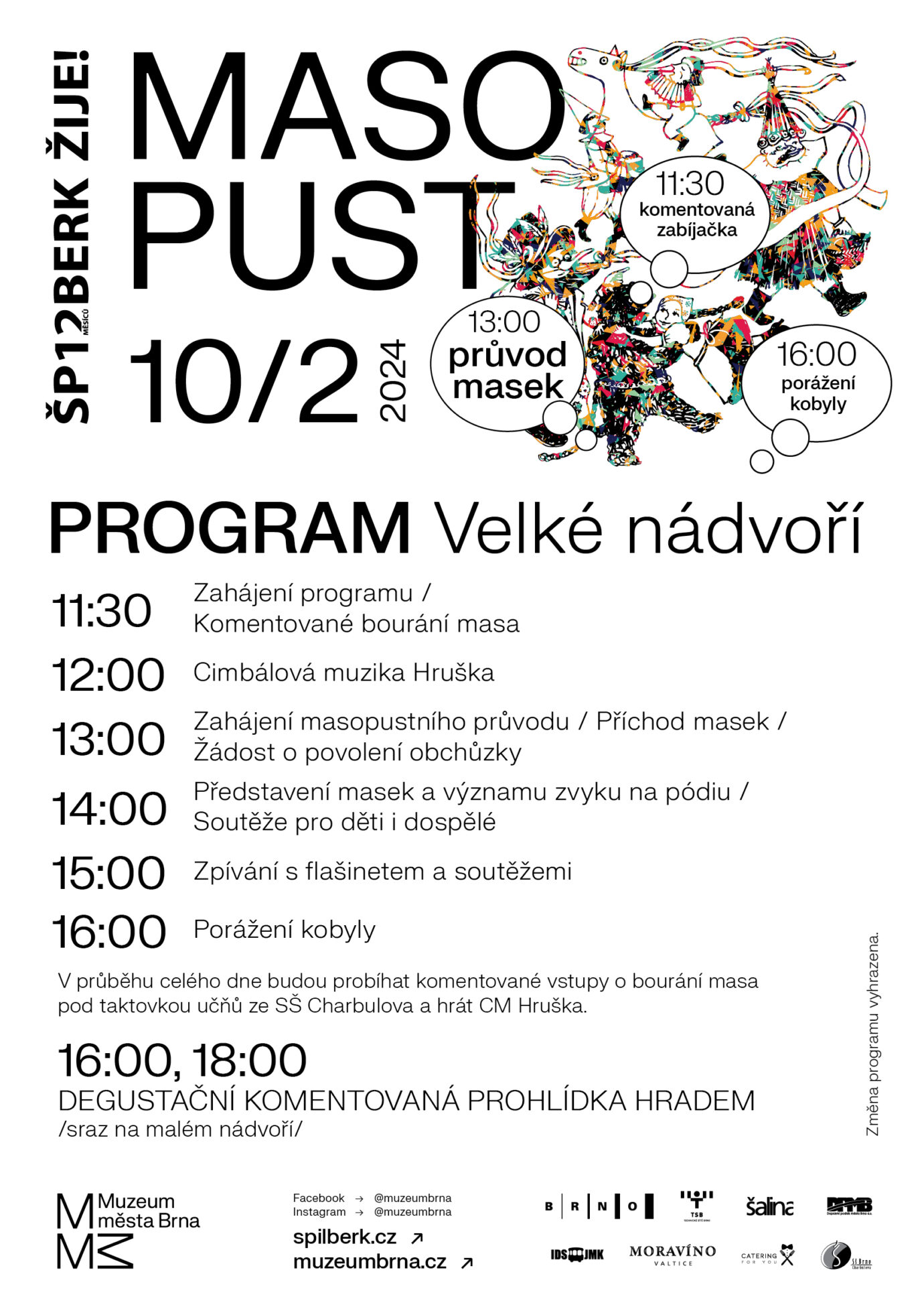 V sobotu 10. února 2024 od 11.30 si mohou návštěvníci hradu Špilberku užít tu pravou masopustní atmosféru. K masopustu patří veselí, dobré jídlo a pití, a především masky a maškary. Hlavním bodem celého programu bude tedy od 13.00 žádost a povolení masopustní obchůzky, následný průvod masek po celém areálu hradu, představení tradice a masek a zakončení tradičním porážením kobyly v 16.00. Svůj řeznický um představí učňové ze střední školy Charbulova při komentovaném bourání masa hned po zahájení v 11.30 i v průběhu celého dne. Samozřejmostí budou také po celý den na velkém nádvoří stánky s tradičními pokrmy a nápoji, opékání špekáčků, soutěže pro malé i velké nebo umělecký kovář. Vstup na akci je ZDARMA.