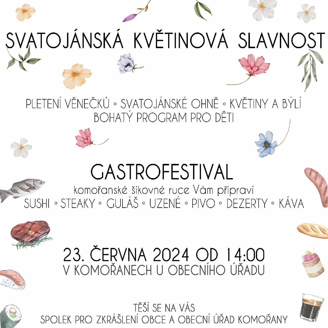 V Komořanech u Vyškova se v neděli 23. června ve 14 hodin uskuteční Svatojánská květinová slavnost a gastrofestival plný různých dobrot. U obecního úřadu bude přichystaný bohatý program, který potěší malé i velké návštěvníky. Svatojánské ohně, pletení věnečků, povídání o bylinkách, sushi, steaky, guláš, dezerty, osvěžující pivo, vynikající káva, kvízy, skákací hrad pro děti… Každý si v neděli přijde na své.