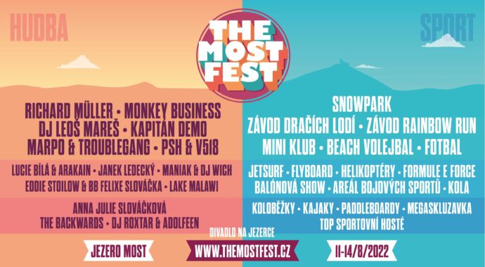 Lákadlem The Most Festu pro sportovní nadšence rozhodně budou dva závody pro veřejnost – Rainbow Run a 10. závod Dračích lodí StarColor Cup. K dispozici bude i skvěle vybavená půjčovna sportovních potřeb. Na souši si můžete užít třeba plážový volejbal, podnikat výzkumné výpravy po okolí na kolech nebo přeplavat „české moře“ na loďce či paddleboardech. Ti odvážnější pak mohou vyzkoušet adrenalinový jetsurfing nebo ještě podmanivější flyboarding.