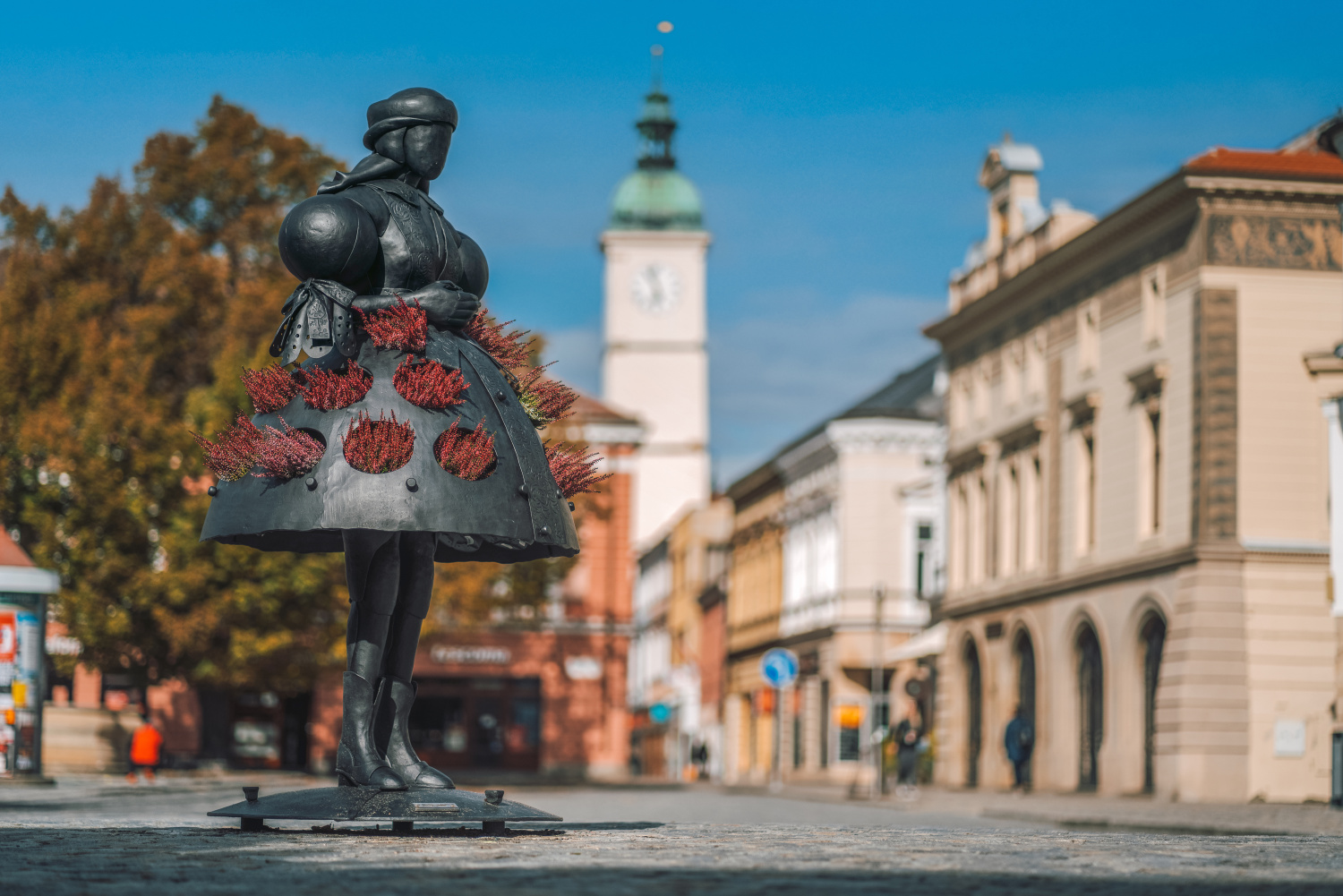 Na Masarykově náměstí si můžete všimnout kované sochy. Je to Mařaťanka, ženská postava v životní velikosti, která na sobě nese stylizaci staroměstsko-jarošovského svátečního kroje, který je typický pro Uherské Hradiště.
