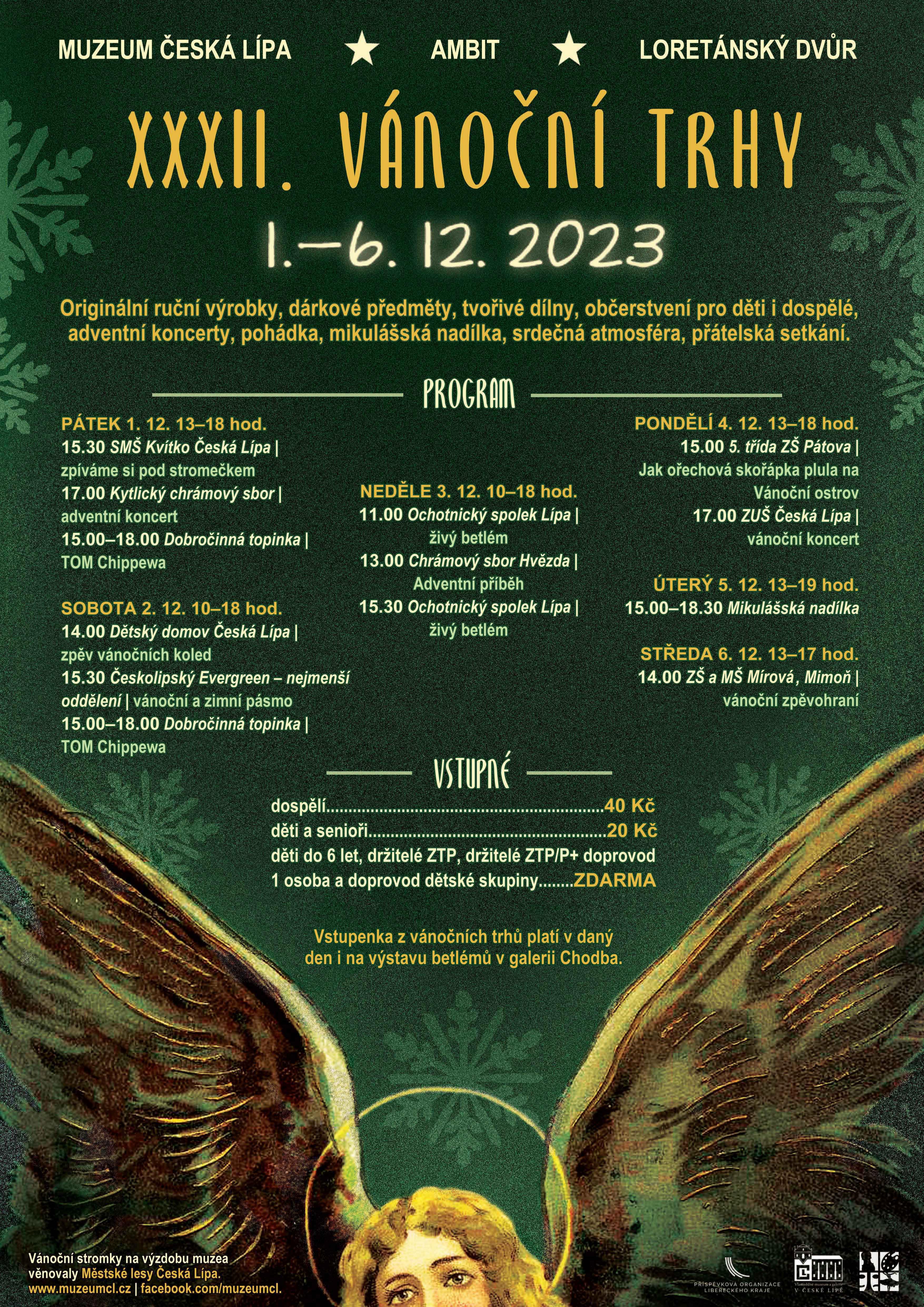 Nedílnou součástí trhů je kulturní program v kapli neboli Biberově koncertní síni. Na letošek je připraveno 7 koncertů, 1 pohádka, živý betlém ochotnického spolku Lípa a v neposlední řadě mikulášská nadílka pod taktovkou muzejníků. Po celý prosinec bude v galerii Chodba probíhat výstava betlému z muzejních sbírek. A bonus pro návštěvníky trhů: vstupenka z trhů platí v daný den právě i na tuto výstavu. Naplánujte si cestu, setkejte se s přáteli, vyberte vánoční dárky, podpořte místní prodejce, udělejte dobrý skutek, užijte si kulturu a přijďte si odpočinout.