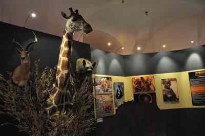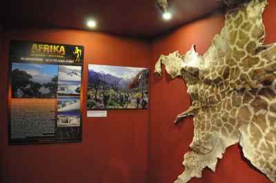 Nedozírná africká buš je plná zvířat. Potkáte žirafy, zebry, antilopy, nejmenší gazely, dikdiky, pakoně, buvoly, dokonce i hrocha! Pozor na mrchožrouta marabu s vytahaným lalokem. Některé zaskočí obří nosorožec, jiné překvapí lev, hyena, levhart nebo na kořist číhající gepard. Nemusíte se však bát, všechna zvířata jsou bezpečně vycpaná. Dokonce i slavnou gabunskou zmiji prezentuje krásná kůže…