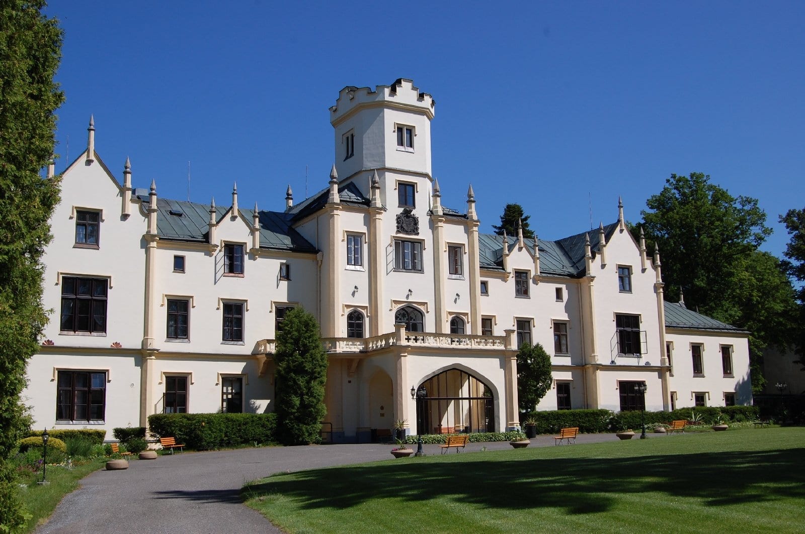 V obci je největší dominantou zámek, jež byl vybudován rodovou větví Popelů z Lobkowicz v letech 1868-1875. Nedlouho poté však vyhořel. Na jeho místě byla postavena nová opět novogotická budova sloužící jako letní a lovecké sídlo. Roku 1906 prodal Bedřich Lobkowicz zámek Pomocnému spolku pro péči o zdraví úředníků a zřízenců v Praze a ten byl později přeměněn na sanatorium. V roce 1993 došlo k privatizaci objektu, který se tak stal soukromým lázeňským zařízením a svému léčebnému účelu slouží dodnes. Zámek je obklopen parkem přecházejícím v okolní rozsáhlé lesy, jimiž vede několik vycházkových okruhů. Nachází se tu také několik kapliček, kříž a pamětní deska na počest padlým.